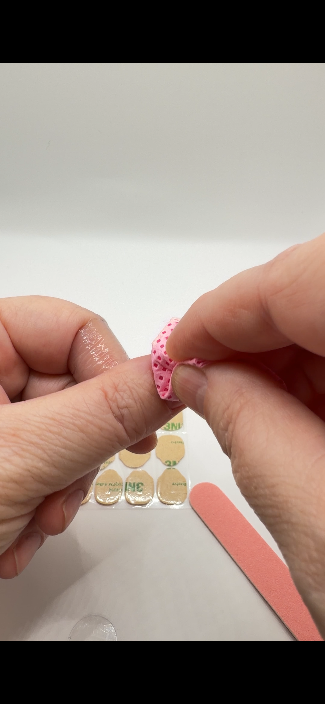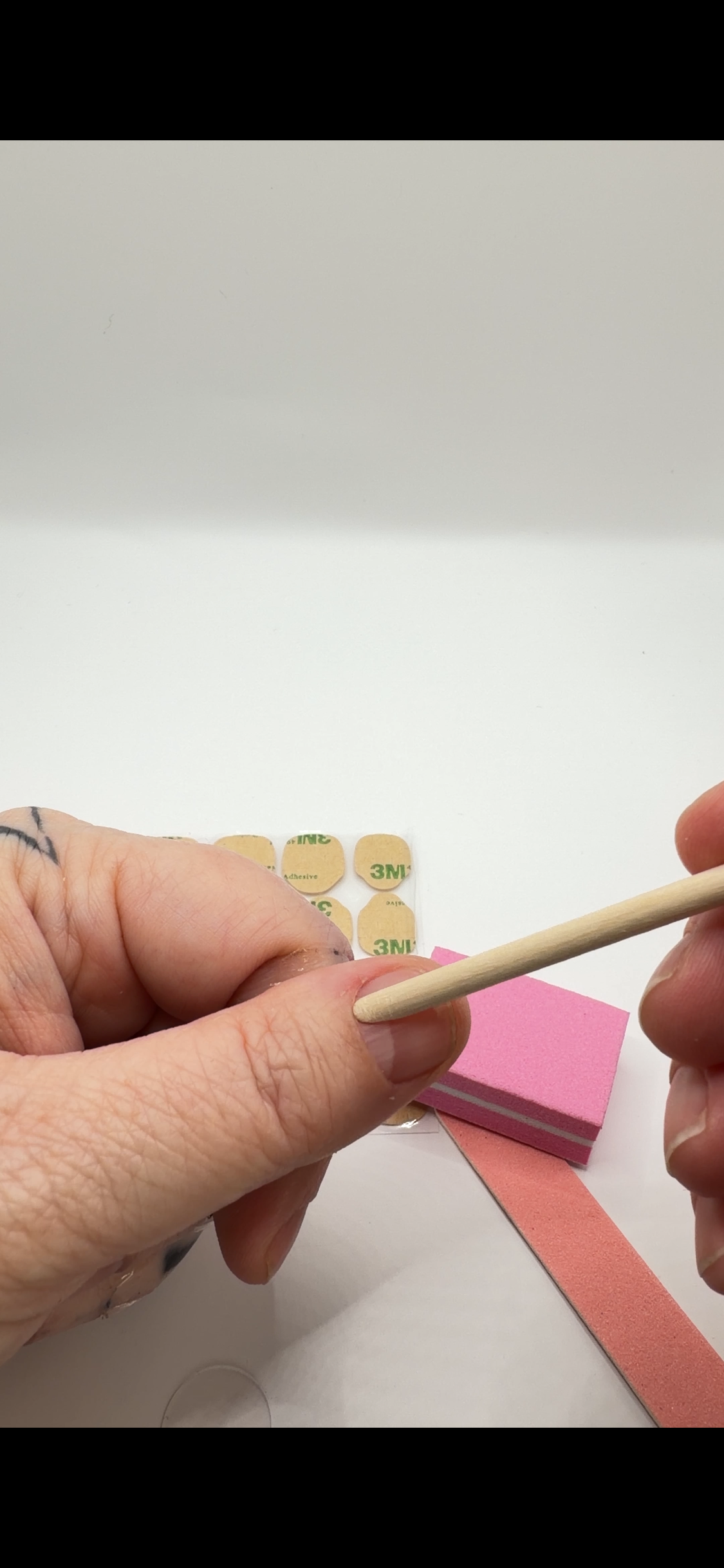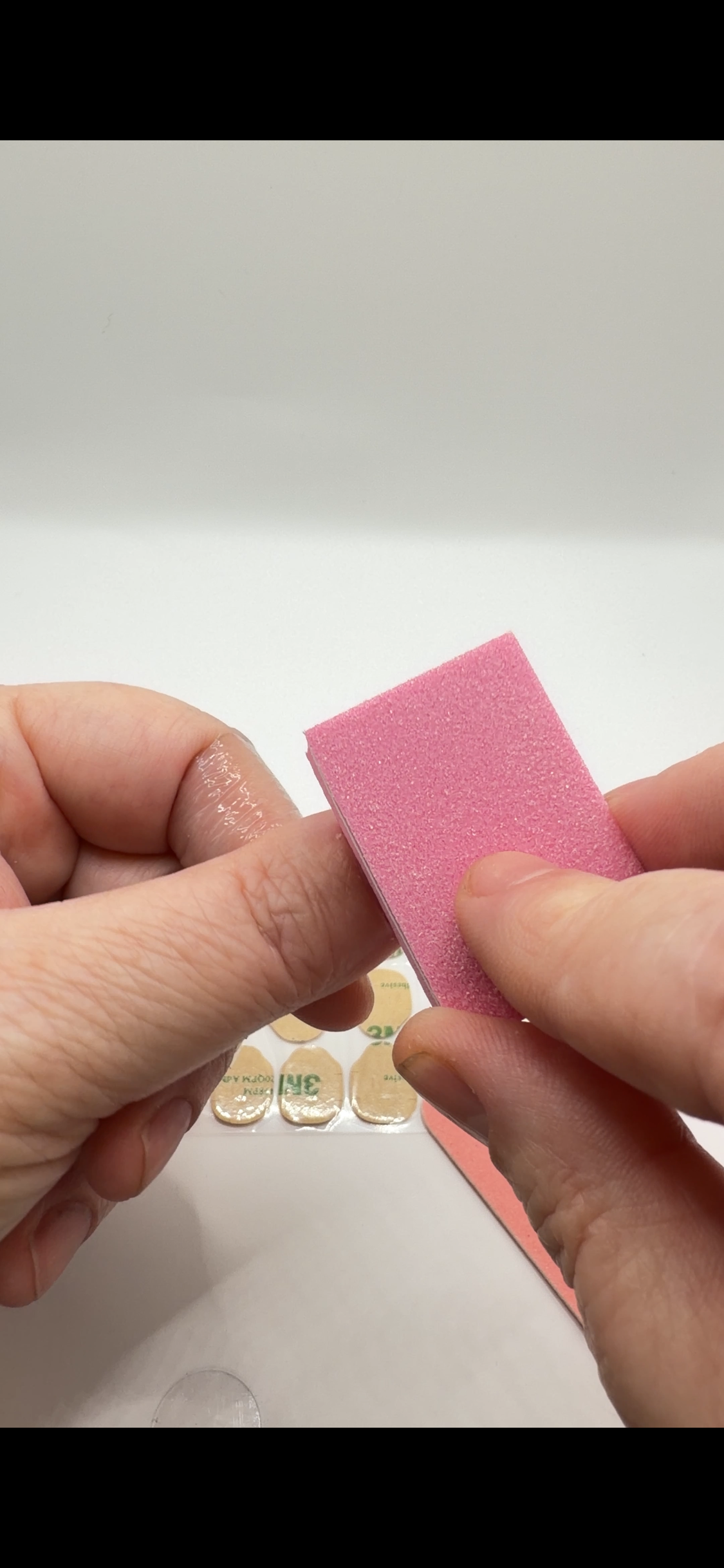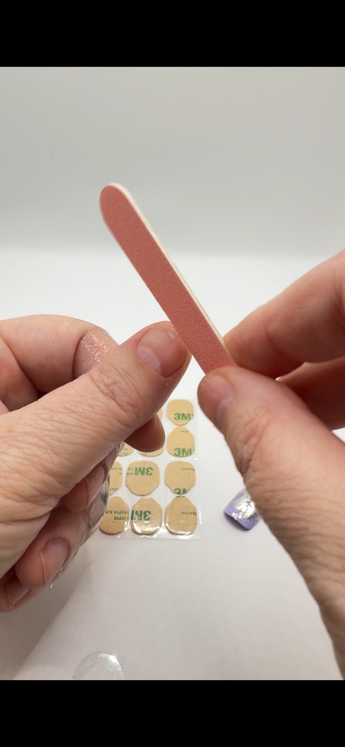 Use the buffer block from your kit to lightly buff the surface of each natural nail. This removes surface shine and helps the liquid glue or adhesive tabs bond more effectively